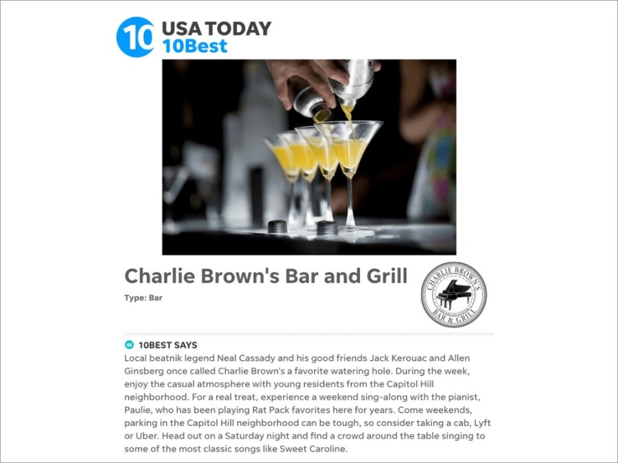 Looking for things to do in Denver? USA Today has an idea: Local beatnik legend Neal Cassady and his good friends Jack Kerouac and Allen Ginsberg once called Charlie Brown’s a favorite watering hole. During the week, enjoy the casual atmosphere with young residents from the Capitol Hill neighborhood. For a real treat, experience a …