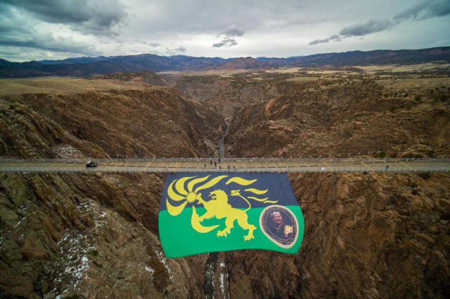 To promote the release of the film “Coming 2 America,” out today, Amazon Studios has hung a 120 x 75 foot flag from the Royal Gorge Bridge. It’s the largest